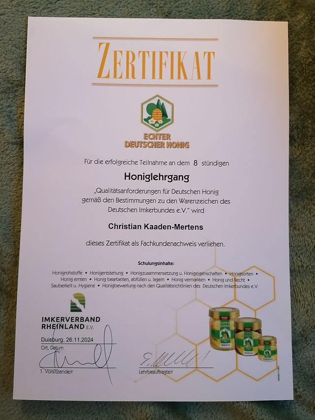 Dieses Honiglehrgang Zertifikat bestätigt, dass unser Honig nach strengen Richtlinien des DIB produziert wird, für reinen Geschmack und höchste Qualität.
