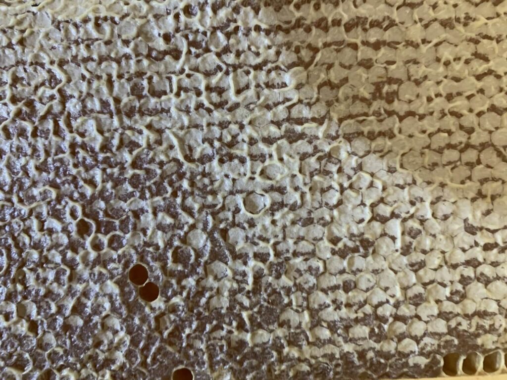1. Die Entnahme: Der richtige Zeitpunkt zählt Honig kann geerntet werden, sobald eine Wabe zu mindestens 75 % von den Bienen mit einer Wachsschicht verdeckelt worden ist. Je mehr, desto besser! Dann ist er „reif“, der Wassergehalt ist niedrig genug und der Honig ist lagerfähig. Wir entnehmen die Waben meist in den Morgenstunden, wenn die wehrhaften Flugbienen unterwegs sind. Die verbleibenden Bienen werden vorsichtig abgekehrt.